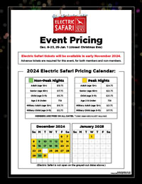 - HOLIDAY-SAFARI THEMED DRONE SHOW! (weather permitting). At 7:30 p.m. every night of Electric Safari, guests can see our drone light show from nearly anywhere in the Zoo. The show will last around 15 minutes. Prime viewing spots are Elephant Boardwalk, Lodge at Moose Lake and Giraffe Plaza.