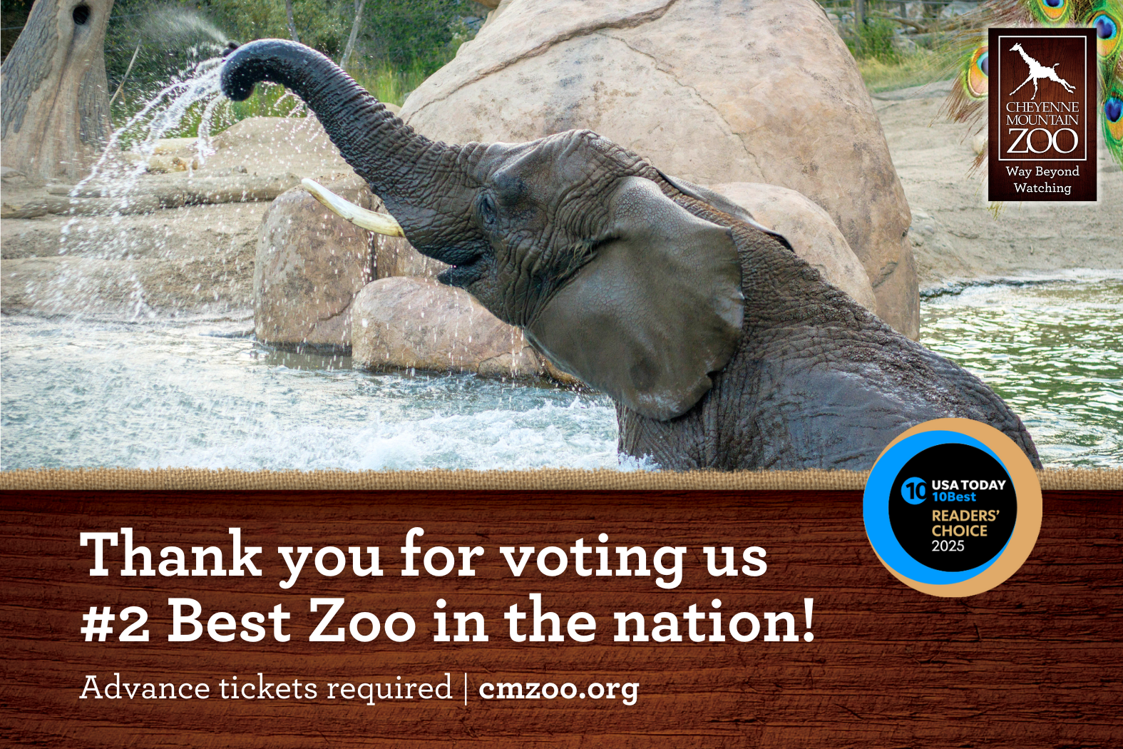 Cheyenne Mountain Zoo was ranked #2 Best Zoo in the country, in USA TODAY’s 10Best Readers’ Choice Awards 2025! Dedicated CMZoo supporters voted daily for a month, and earned the Zoo its highest ranking ever.
